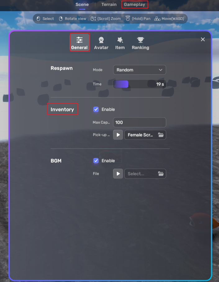 You can set the maximum capacity for your inventory, ranging from 20 to 100, and select the music clip that plays when you collect an item.