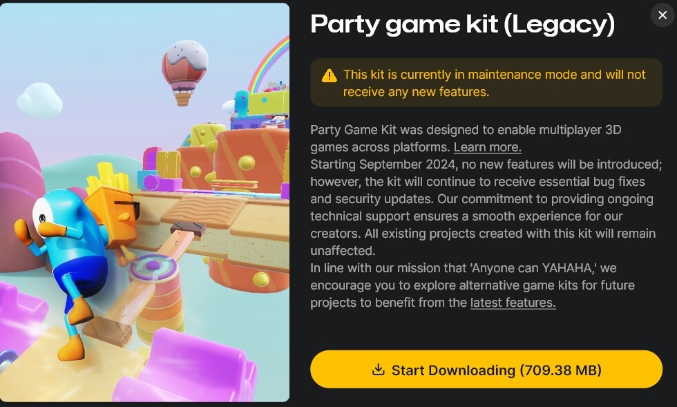 Existing Party projects will remain unaffected by this change. To manage these projects or create new ones, please follow the instructions on YAHAHA Desktop (Desktop) and download a dedicated Party Studio, which is available starting September 27, 2024. You may notice that Party Game Kit is now labeled “Legacy”.
