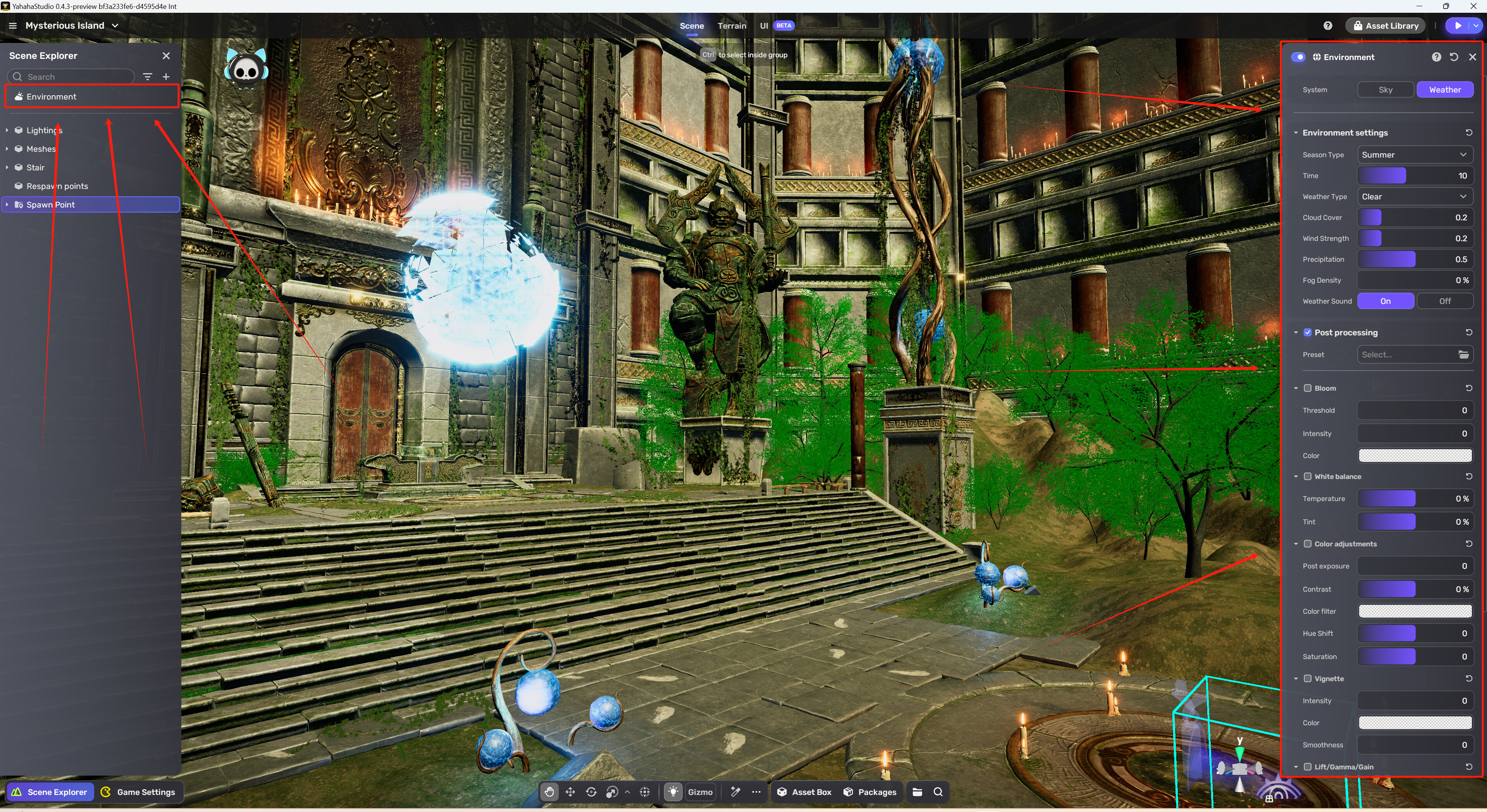 In Yahaha Studio → Scene Explorer → Environment → Weather, weather-related settings can be easily adjusted in the inspector panel.