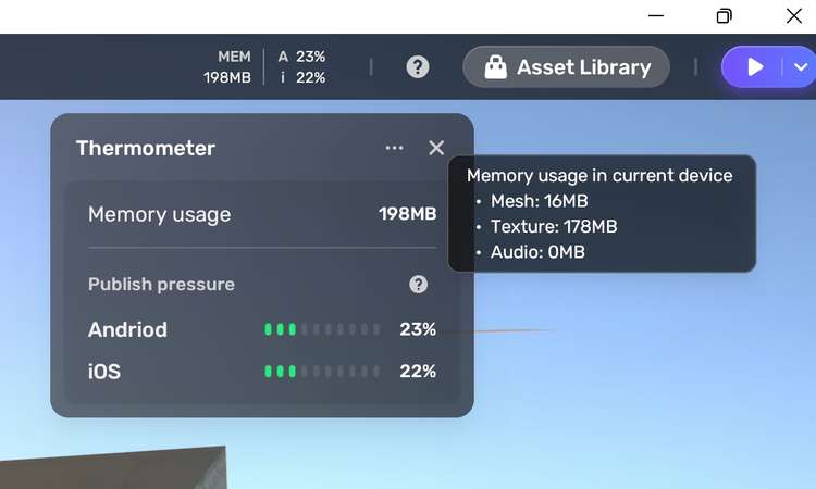 Object Thermometer is a profiler for Edit mode, we calculated the memory of your current scene when your space is played on different devices, e.g. iOS and Andriod.